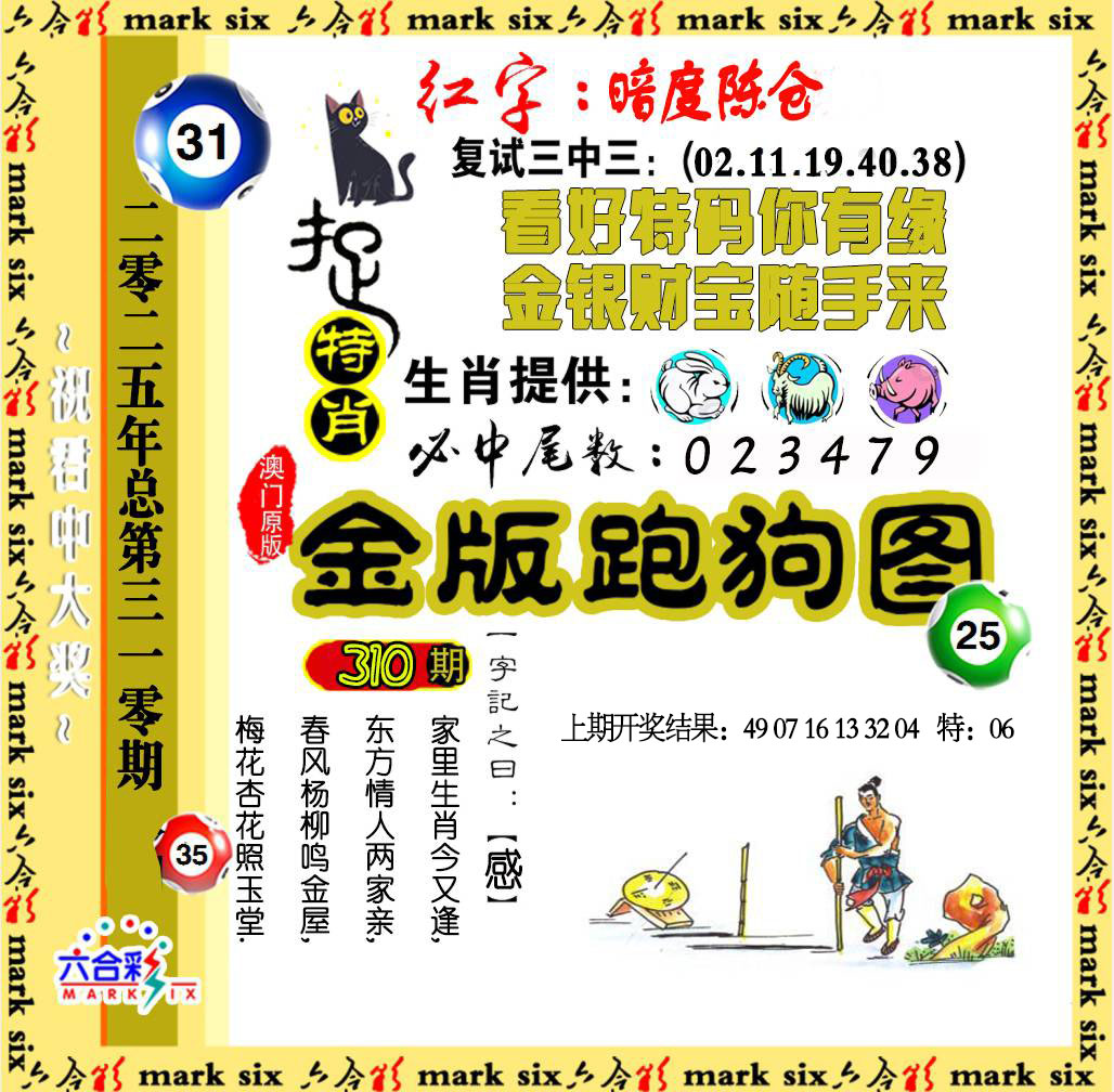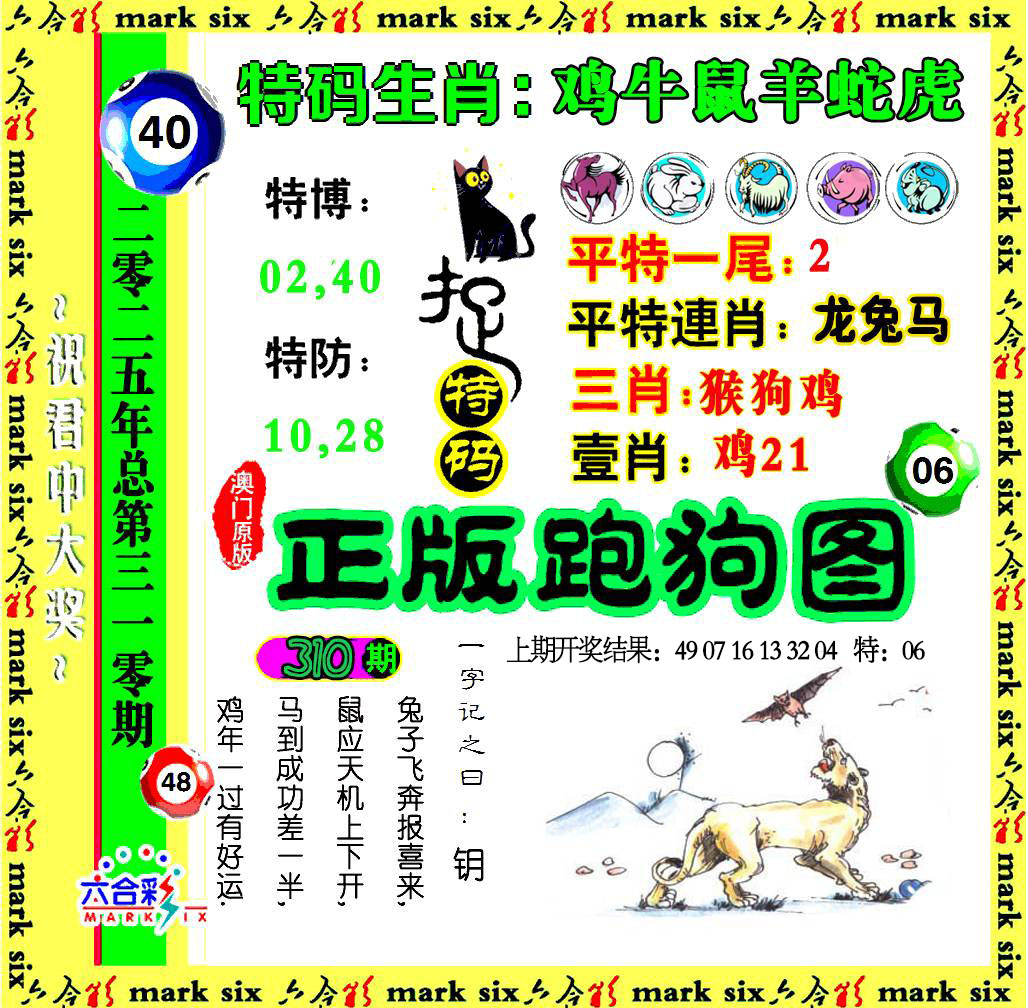 | 310期七肖 | 虎猴兔蛇鸡龙狗 | 开:?00中 |